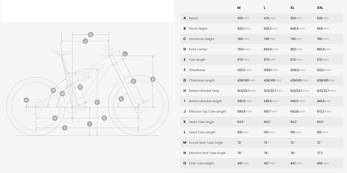 The bike offers 5 headset angle settings, 2 bottom bracket height settings, and 4 chainstay length settings. Users can combine these settings based on different riding styles and terrain conditions. Theoretically, these parameters can form up to 40 geometry configurations. The specific adjustable range and applicable effects are subject to actual usage.