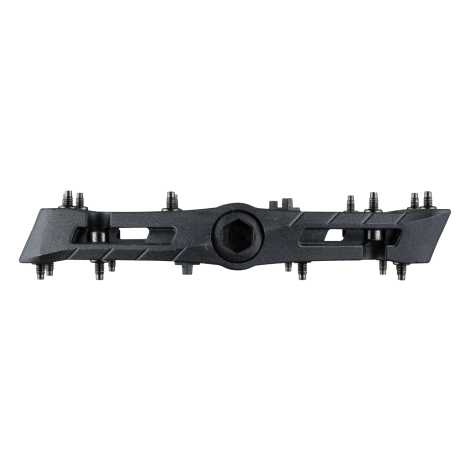 Pin placement, type and quantity: Chester now has nine metal pins and two molded plastic pins for a total of 11 pins per pedal side (three more than previous model). The pins were strategically placed for more consistent grip around the entire pedal circumference and a more concave feel. The metal pins also have smaller, threadless tips, which improves grip and lets riders reposition their feet as needed. Threadless pin tips also make pin removal easier for when riders inevitably replace them, as well as making the pins less damaging to skin in the event of a “shinner.”
