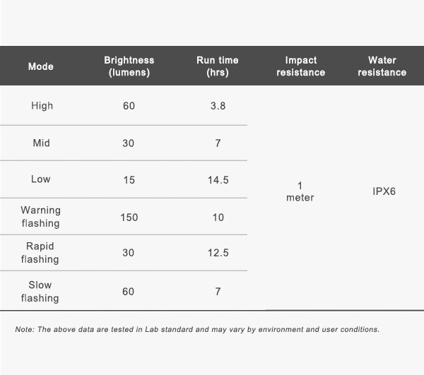 - Daytime visible warning flashing mode: With a maximum of 150 lumen output and unique flashing patterns, the warning flashing mode is specifically designed for your daytime riding and is visible from up to 650m away.