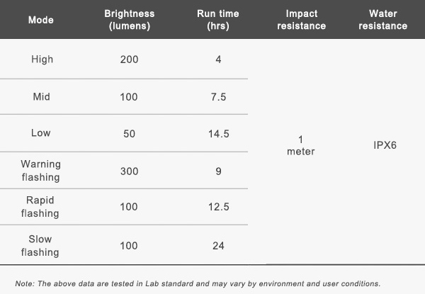 - Eye-catching warning flash for daytime running and multiple brightness levels for various riding conditions