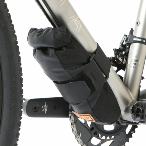 The Downtube Bag has a fully waterproof construction, with a roll top closure to keep the elements, road spray or trail debris where they should be. A single integrated, velcro strap wraps around the Downtube Bag and downtube, securing it tightly in place and minimising rattles. A stitched in grip pad prevents the bag from sliding out of position. The bolt-free attachment means the Downtube Bag can be swapped from bike-to-bike in seconds.