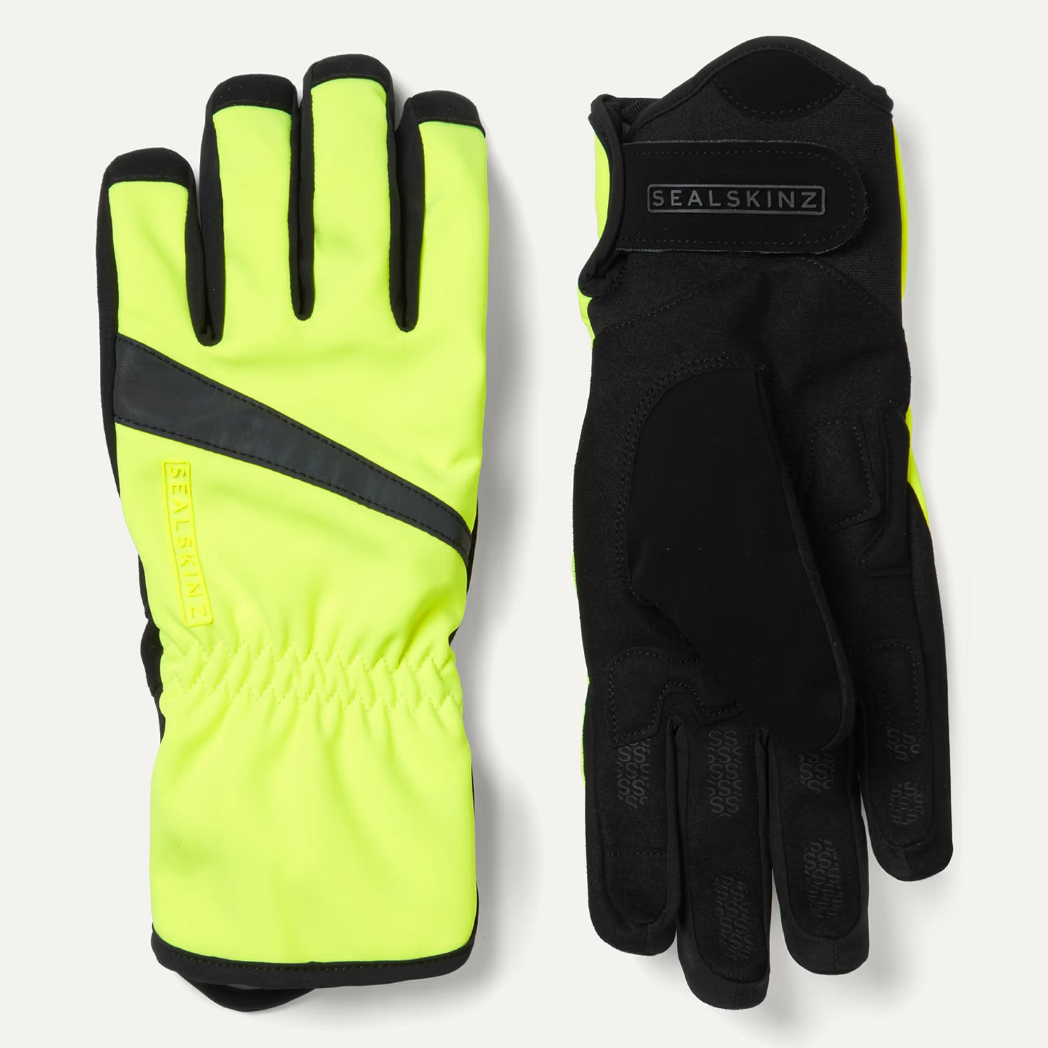 Sealskinz original, waterproof, durable cycling glove that was made for wet weather. Aquasealz™ three-layer composition balances waterproofness with breathability, letting perspiration escape. Hands remain dry and aerated during every ride. Palm replicates feel of suede, maintaining grip after continued use. A PU suede thumb wiper can be used to clean glasses or wipe sweat away. Reflective detailing makes cycling at night safer. Clever zero liner movement technology prevents bunching inside glove.