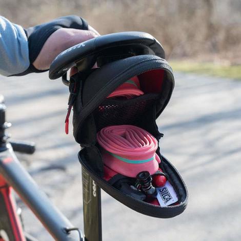 Seat Capsule Premio was designed to suit the needs of a wide range of cyclists thanks to its large carrying capacity. The high-strength thermoformed shell creates a void that measures 625cc and can hold up to a 29.2.35” or two 700x30mm inner tubes. The internal pocket dividers comfortably hold a set of tire levers, a multi-tool, a CO2 regulator and up to three CO2 cartridges.